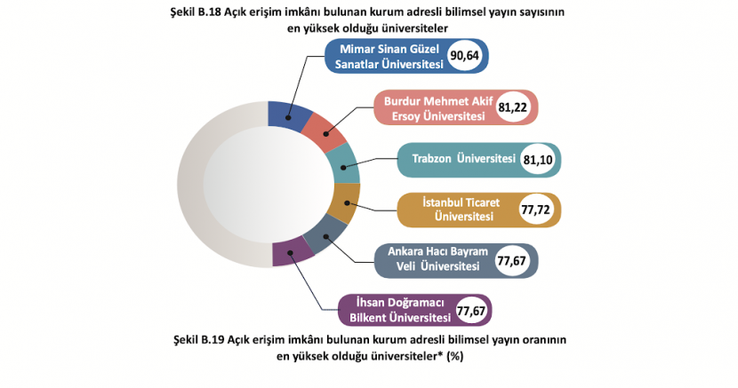 193 üniversitenin verilerinin analiz edildiği raporda, “Araştırma-Geliştirme, Proje ve Yayın" başlığı altında yer alan “Kurum adresli bilimsel yayınların açık erişim oranı” alt göstergesinde 193 üniversite “ilgili ulusal veya uluslararası hakemli dergilerde yayımlanmış ve tam metnine ulaşılabilen yayın sayısının, aynı yıl üniversite adresli yayımlanan toplam sayısına oranı” dikkate alınarak sıralandı. Yalnızca makale ve derlemelerin dâhil edildiği değerlendirmede TÜBİTAK ULAKBİM-TR Dizin ve InCites Clarivate kaynaklı veriler baz alındı.